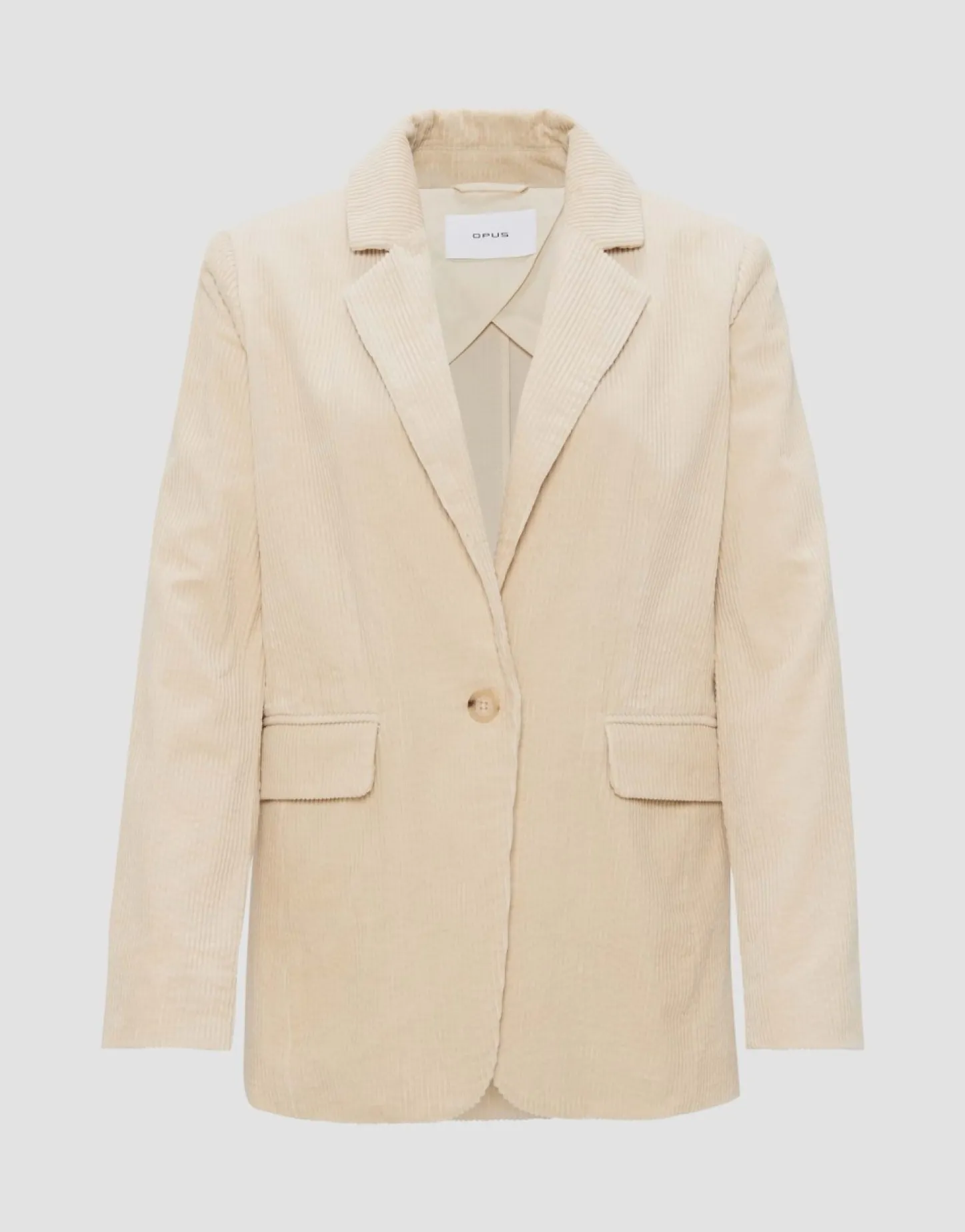 Deze Blazer Van Zacht Ribfluweel Heeft Een Licht Getailleerde Pasvorm En Klassieke Details. Het Oppervlak Voelt Zacht Aan En Straalt Het Retrokarakter Van De Jaren 70 Uit. De Blazer Sluit Met Een Grote Knoop In Hoornlook.