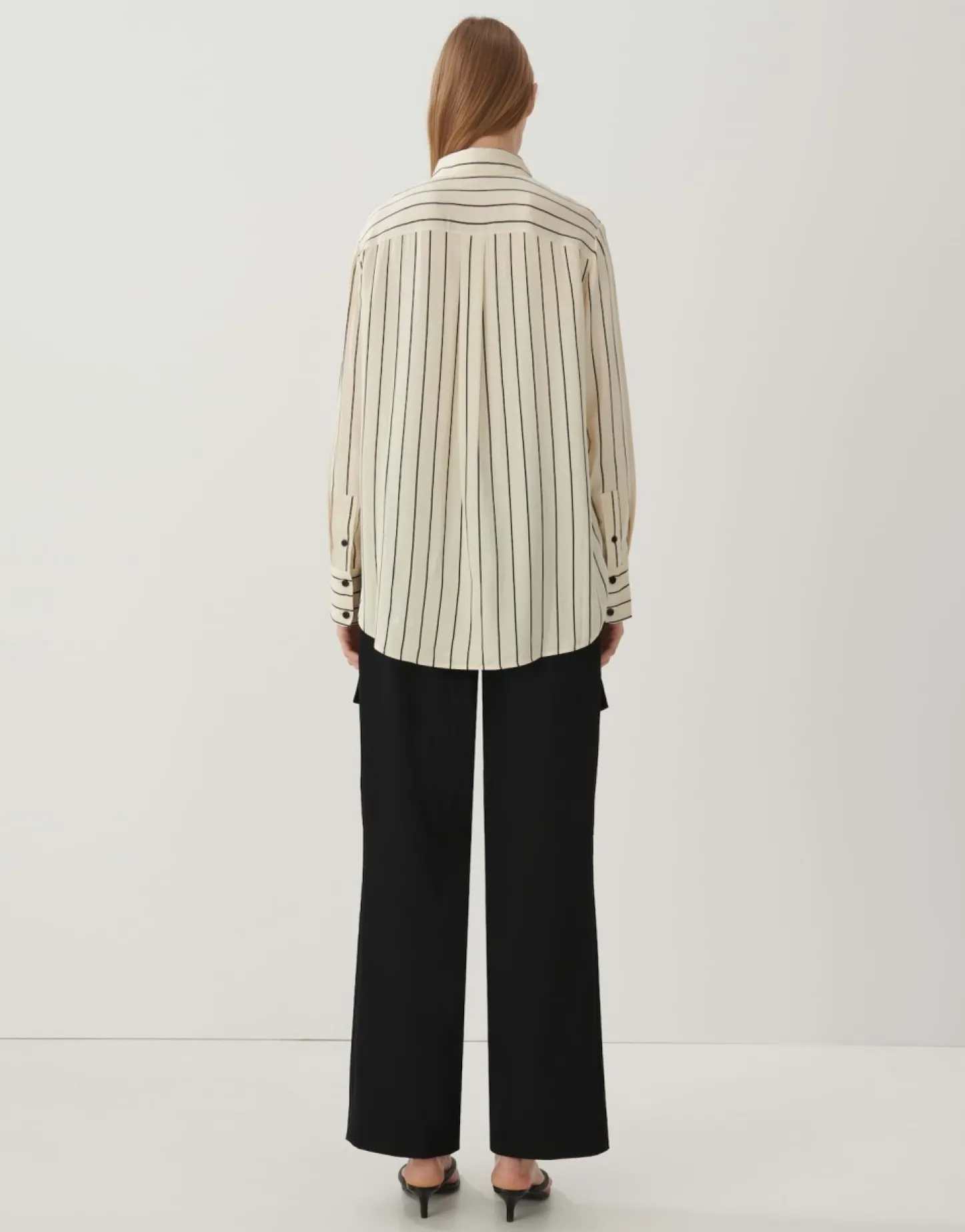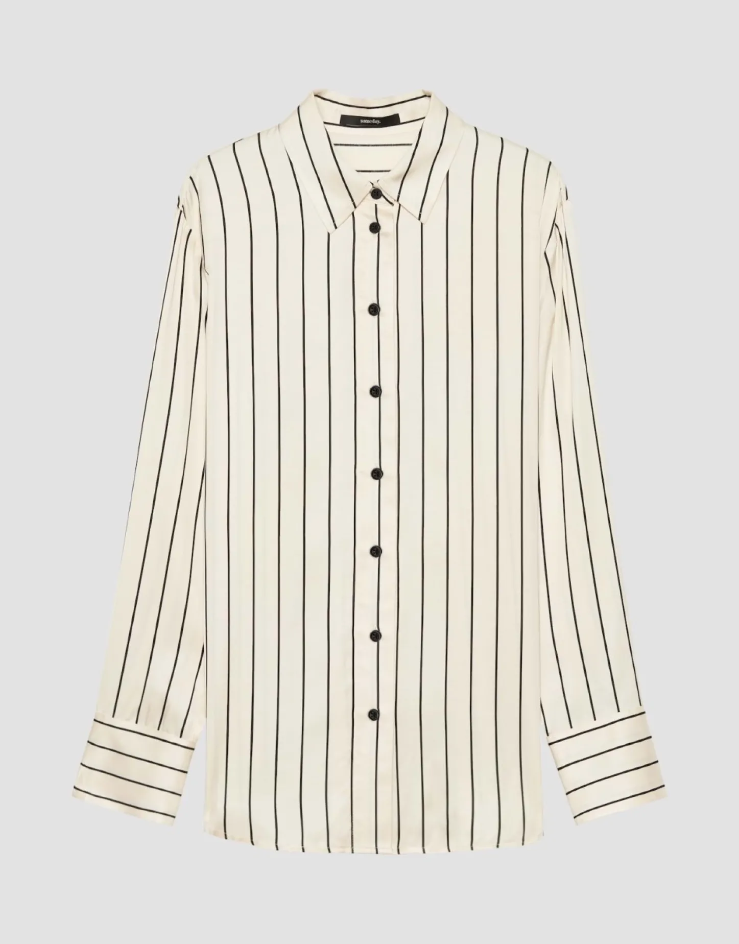 De Gestreepte Blouse Van Vloeiende Ecovero™ Viscose Speelt Met Een Prachtig Streeppatroon Over Een Satijnen Stof. De Lange Knoopsluiting Met Contrasterende Knopen Biedt Een Geweldig Contrast.
