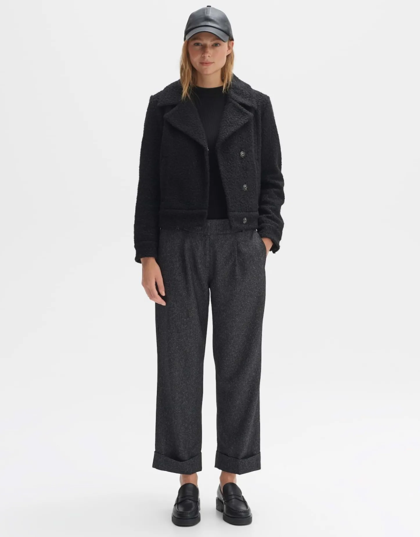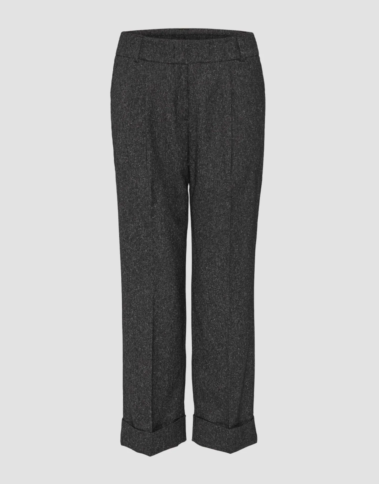 De Stoffen Broek Is Gemaakt Van Een Elastische Viscosemix En Heeft Een Prachtige Peper-En-Zoutlook. Een Brede Boord Geeft De Broek Een Verkorte Pijp. De Vouwen En Plooien Geven De Broek Een Elegante Look.