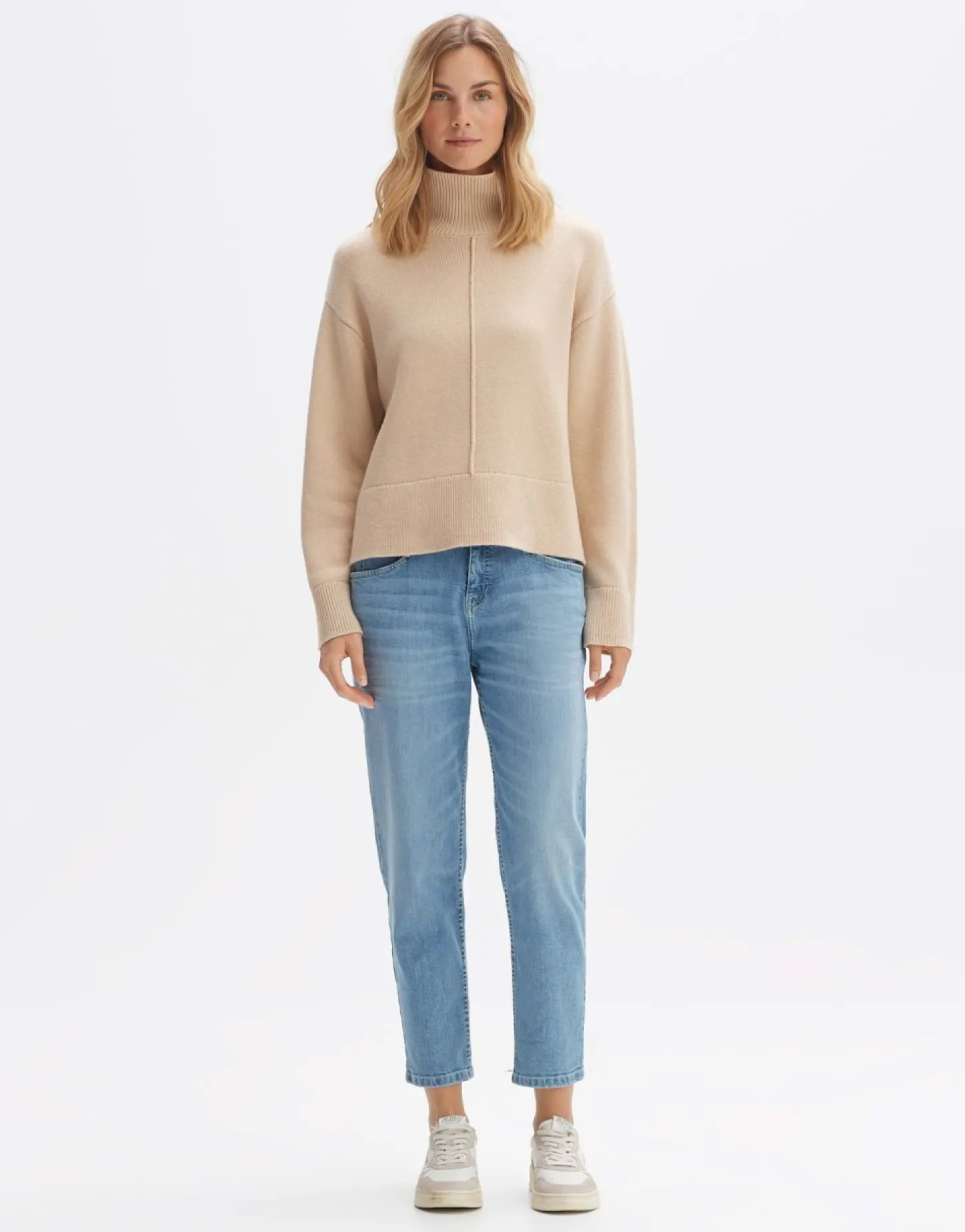 De Gebreide Trui Van Een Zachte Wolmix Leeft Van De Kleine Details Zoals De Centrale Siernaad En De Hoge, Contrasterende Rib Aan De Kraag, Tailleband En Mouwzoom. Het Silhouet Is Puur En Ontspannen Gehouden Met Wijde Mouwen – Voor Maximaal Comfort.