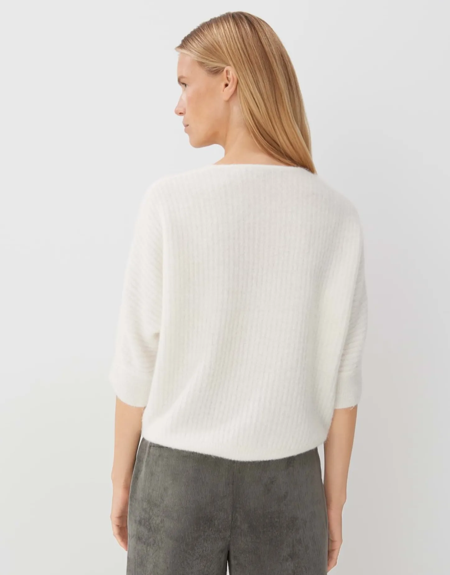 De Gebreide Trui Leeft Van Een Donzig Oppervlak En Een Prachtige Geribde Look. De Overlappende Vleermuismouw Loopt Direc…