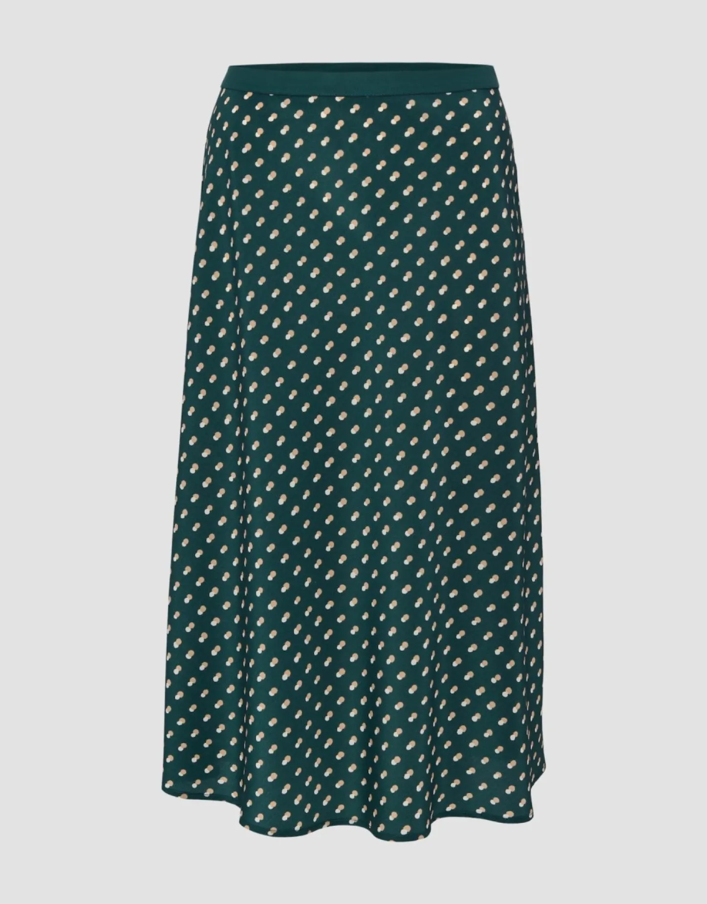 De Midirok Van Een Vloeiende Stof Ziet Er Vrouwelijk Uit Met Zijn Licht Uitlopende Silhouet. De Stippen Benadrukken De V…