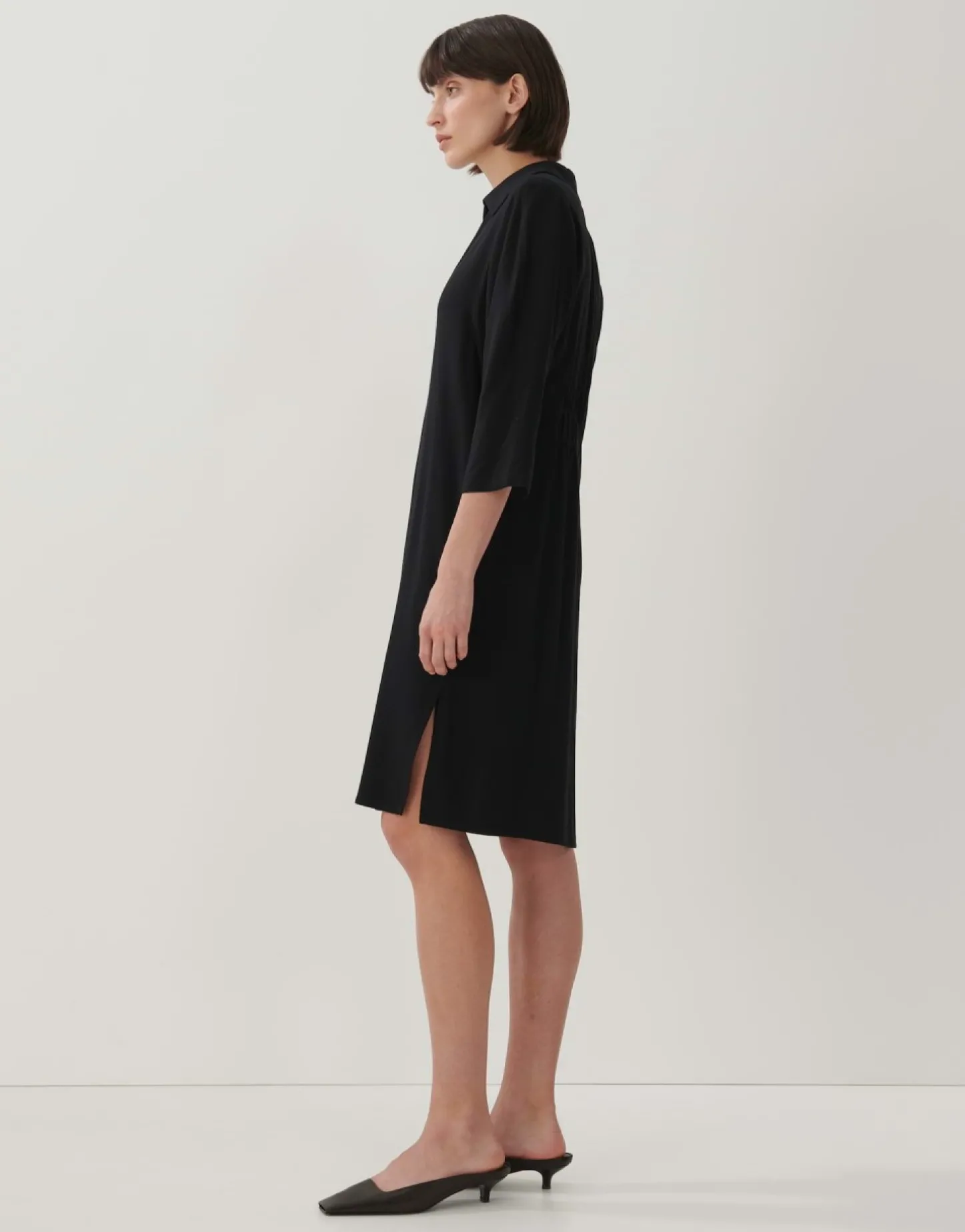 De Overhemdjurk Van Ecovero™ Viscose Is Op Knielengte Gesneden En Heeft Een Klassieke Overhemdkraag. De Speciale Highlight Op De Rug: Een Breed Rimpeldetail Accentueert Het Silhouet Op Een Nog Vrouwelijkere Manier.