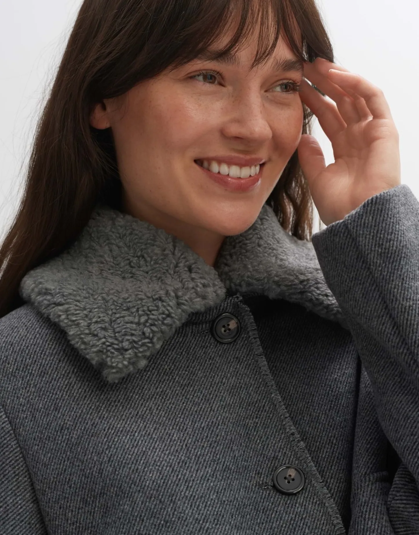 Het Korte Jack Van Een Wolmix Heeft Een Retro-Look Twill-Structuur En Is Een Echte Blikvanger Dankzij De Grote Reverskraag Met Teddybontrand. De Coole Retrolook Wordt Ondersteund Door De Grote, Opgestikte Klepzakken Met Franjes.