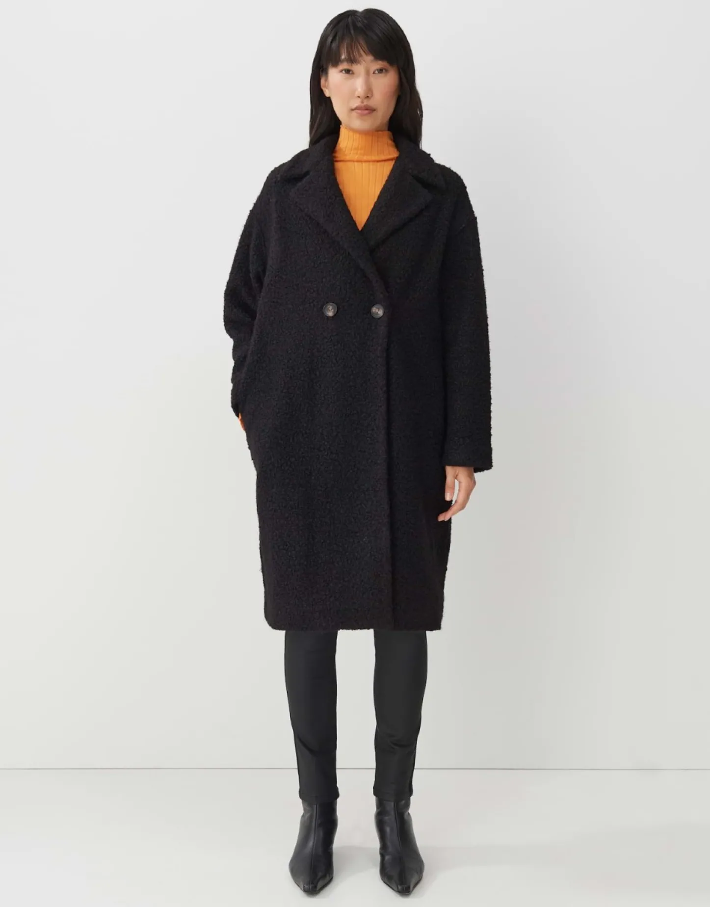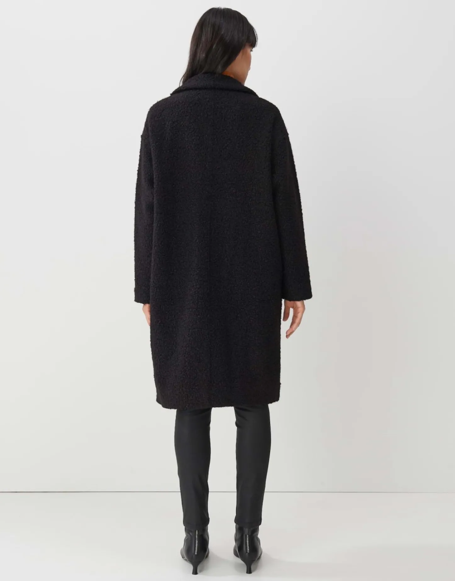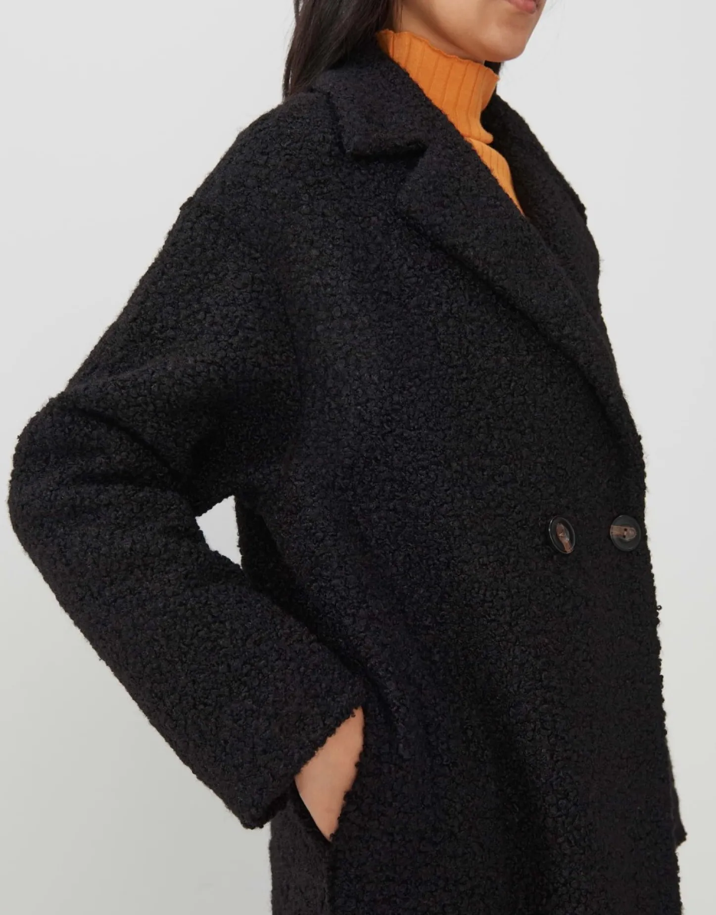 De Jas Is Gemaakt Van Een Zachte Viscosemix En Heeft Een Modieuze Imitatiebontlook. De Ruches Geven De Knielange Jas Een Dynamisch Oppervlak. Hij Kan Worden Gesloten Met Een Dubbele Rij Knopen.