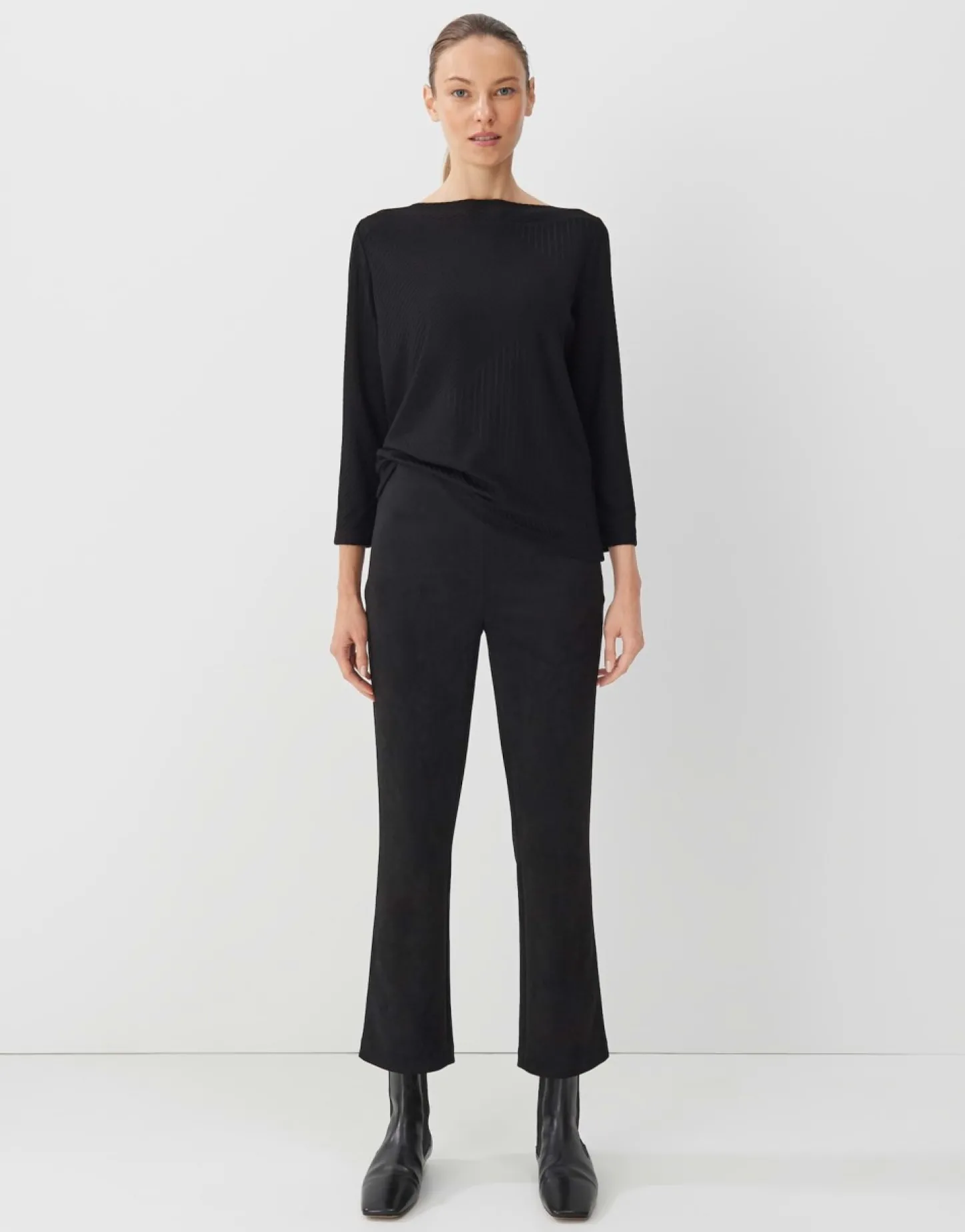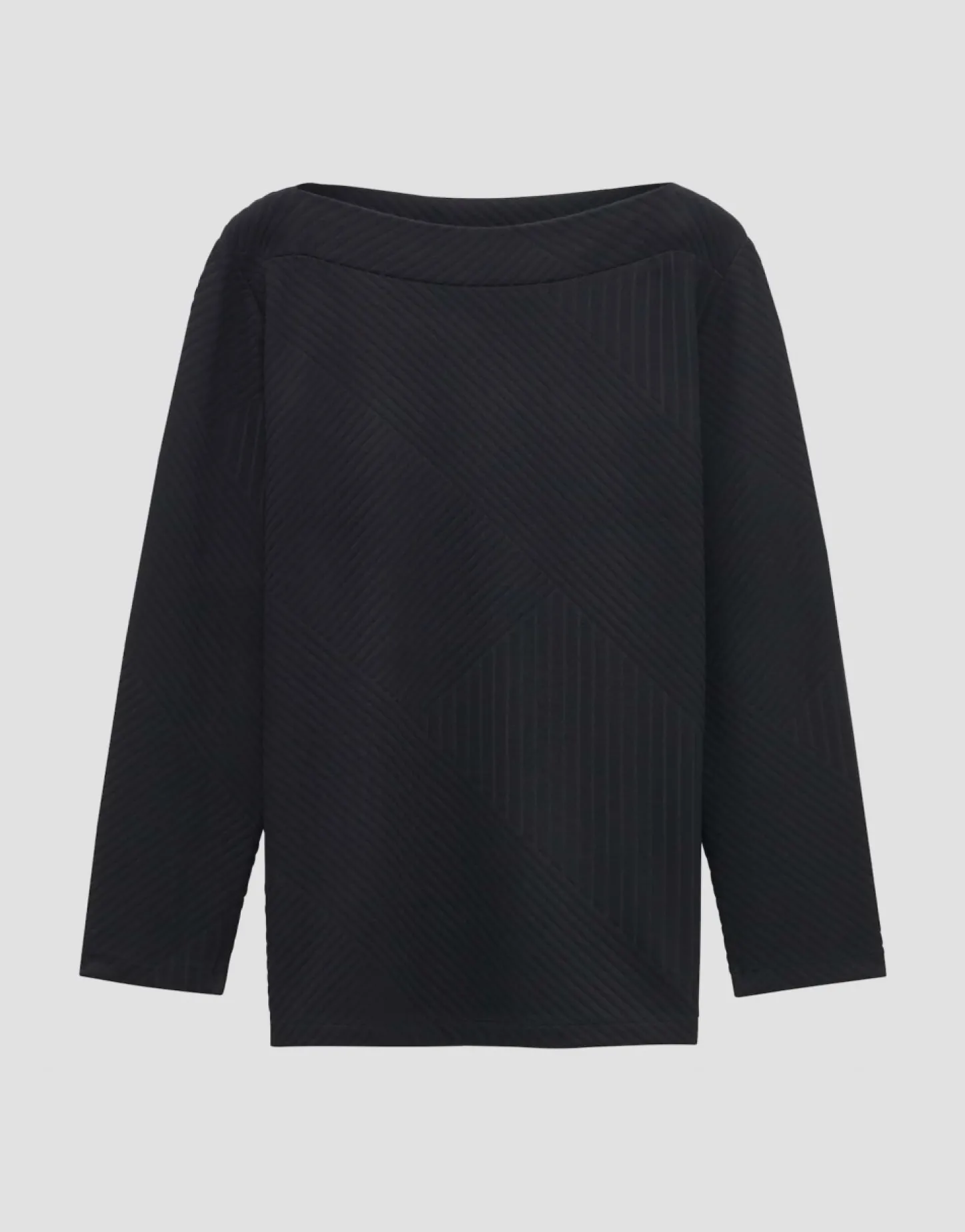 Het Shirt Van Een Vloeiende Stof Krijgt Een Geweldig Puzzeleffect Door De Speciale Rangschikking Van De Ribboorden. De Ronde Halslijn Maakt Het Shirt Met Lange Mouwen Elegant Af.