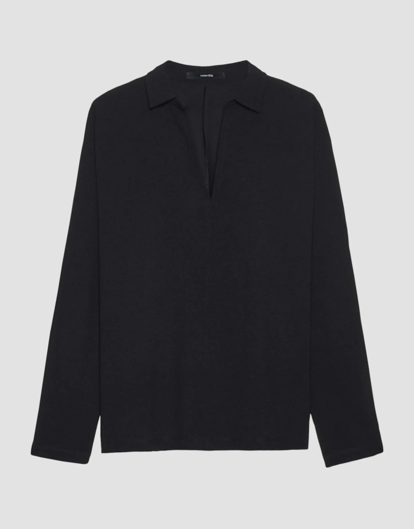 Het Shirt Is Gemaakt Van Vloeiende Blousestof Aan De Voorkant En Een Zachte Viscosemix Aan De Achterkant. De Polokraag En Losse Pasvorm Met Overgesneden Mouwen Geven Het Shirt Met Lange Mouwen Een Sportieve Look.