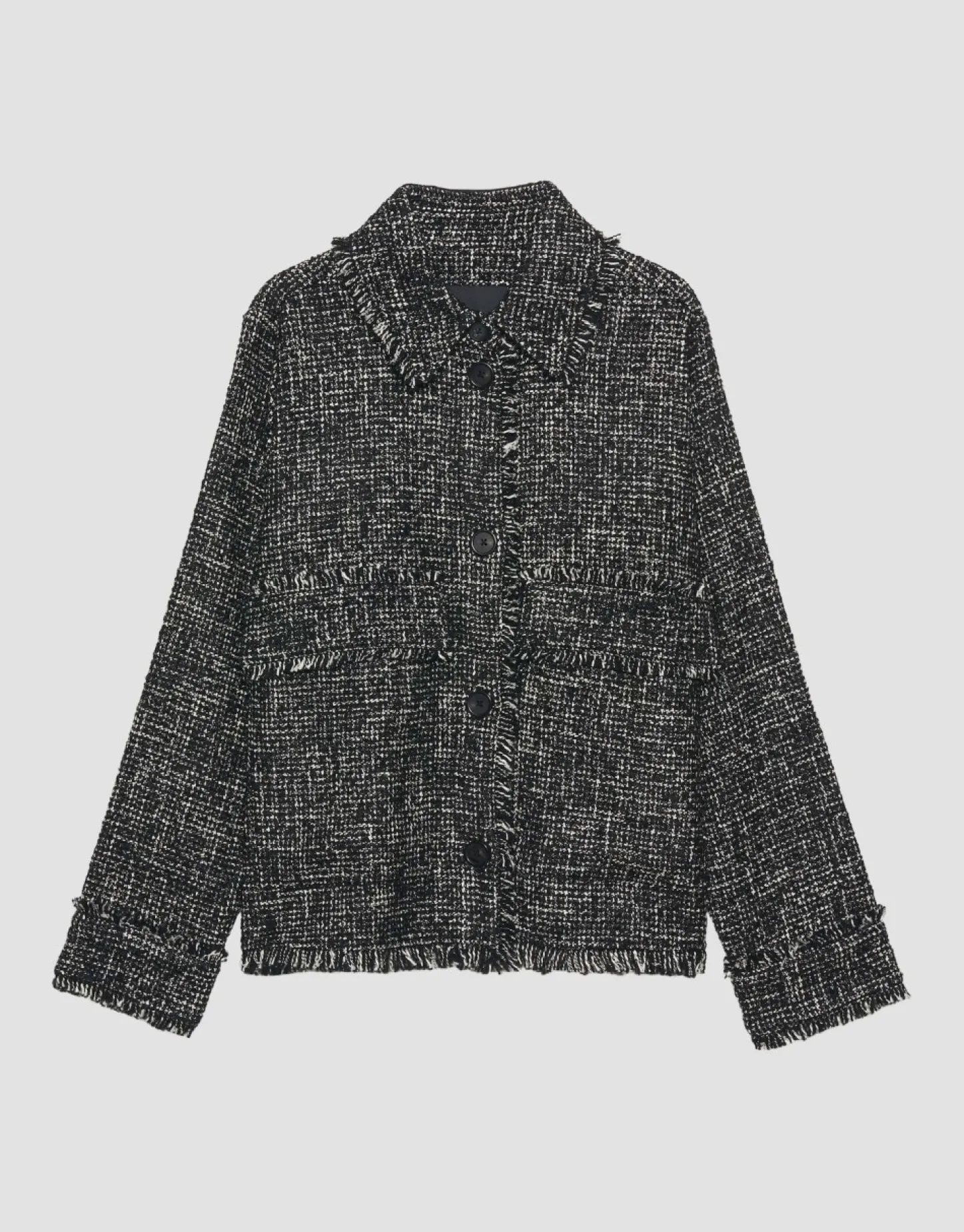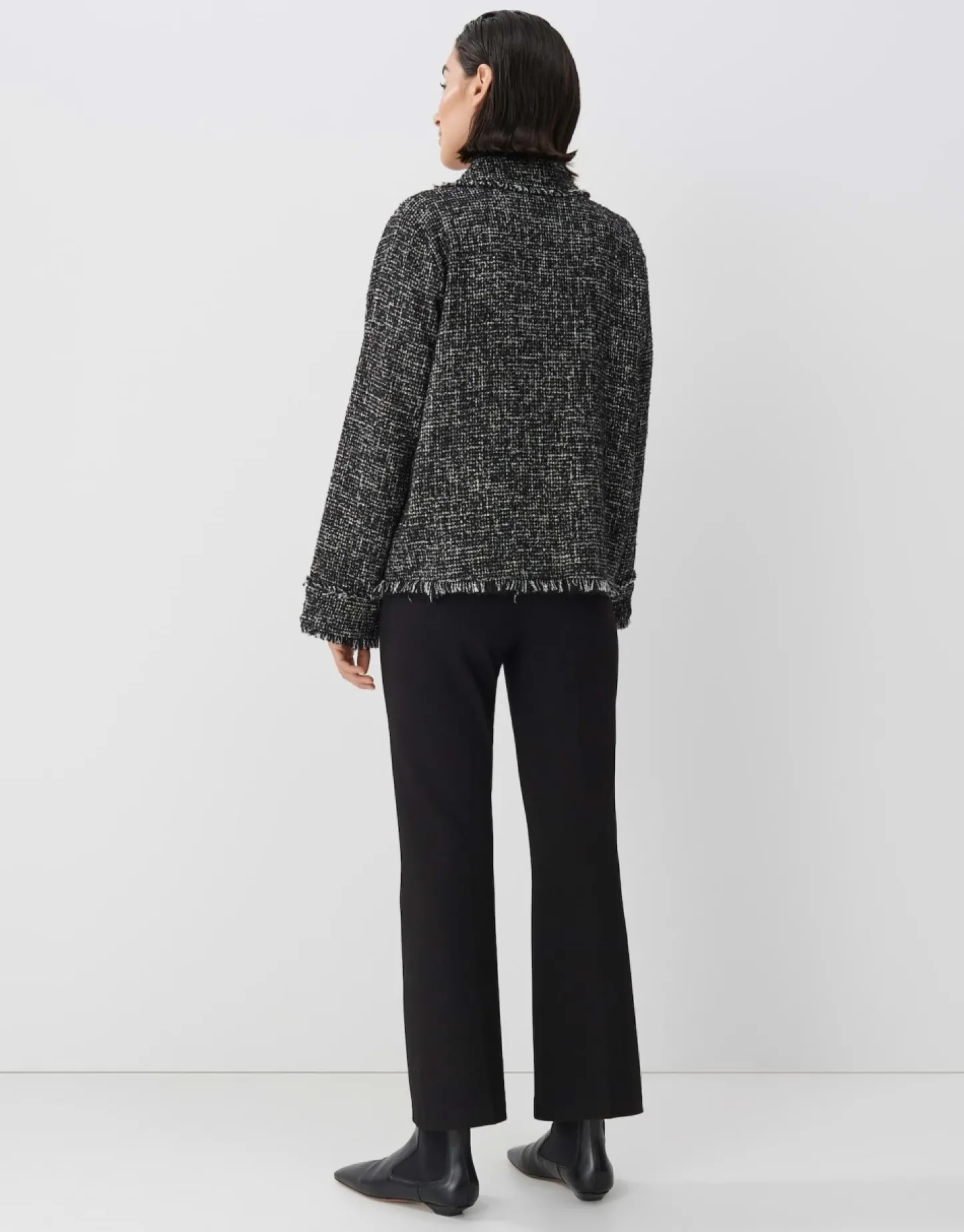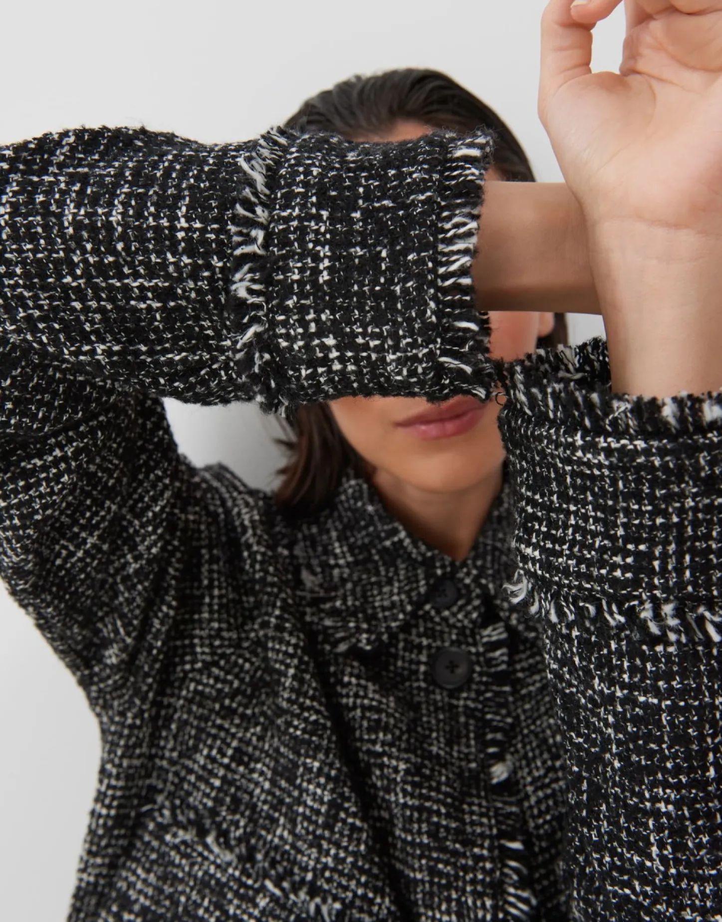 Het Blazerjasje Van Bouclestof Krijgt Een Stoere Touch Door De Open Randen Met De Franjes. De Grote Opgezette Klepzakken Maken De Klassieke “Chanel”-Look Van Het Jasje Ook Wat Losser.